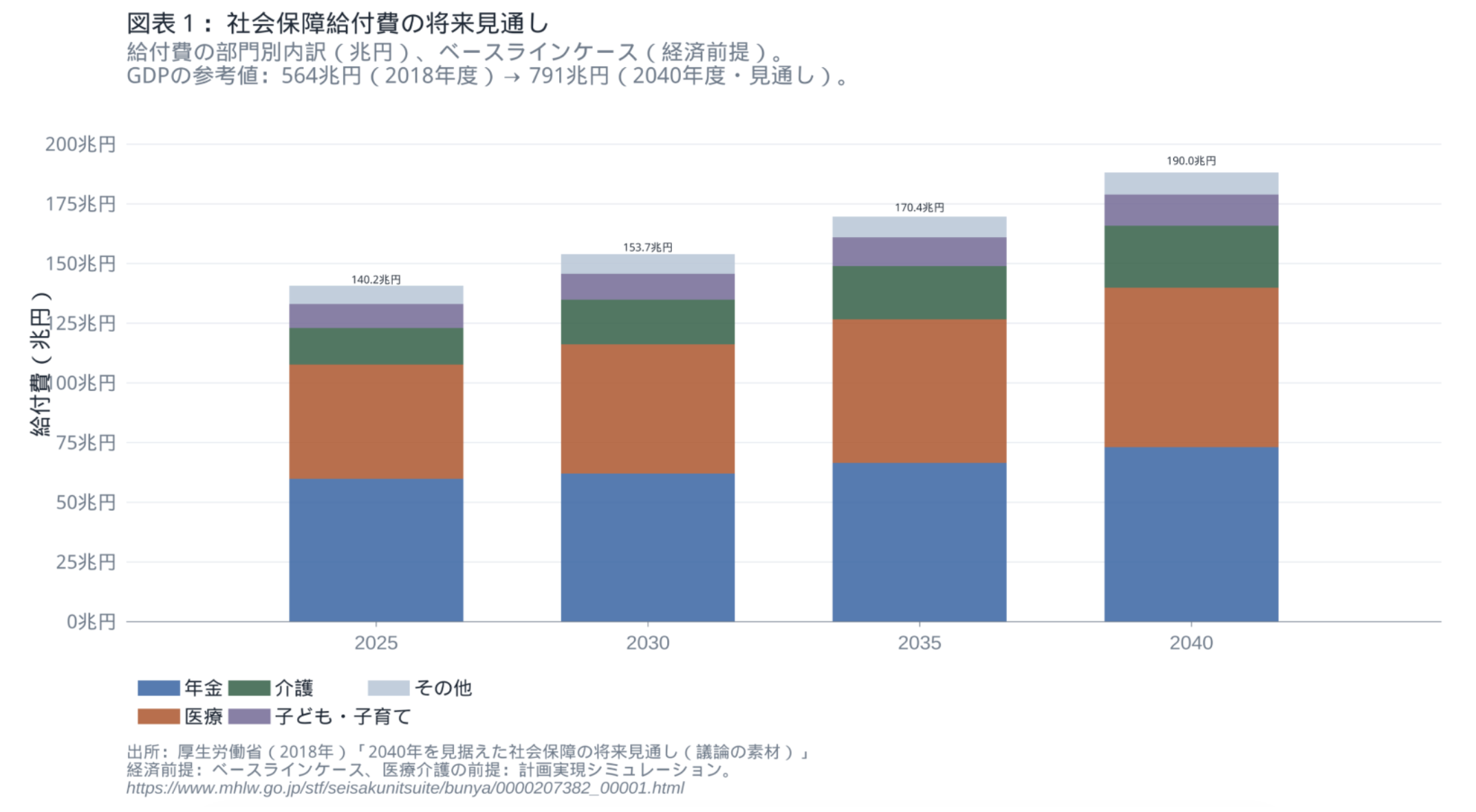 政府支出を巡る需要の競合に加え、日本において医療、介護、年金、および福祉を網羅する社会保障の費用は増大し続けている。社会保障費は、主に人口の高齢化に伴う医療費および介護費の増加を背景に、20年前のGDP比約7%から現在では約11%にまで上昇している。2025年度の一般会計予算において、社会保障関係費は歳出総額の33%以上を占めるに至っている。現在の予測では、社会保障費の総額は2040年に向けて増加し続けると見込まれている。⁹