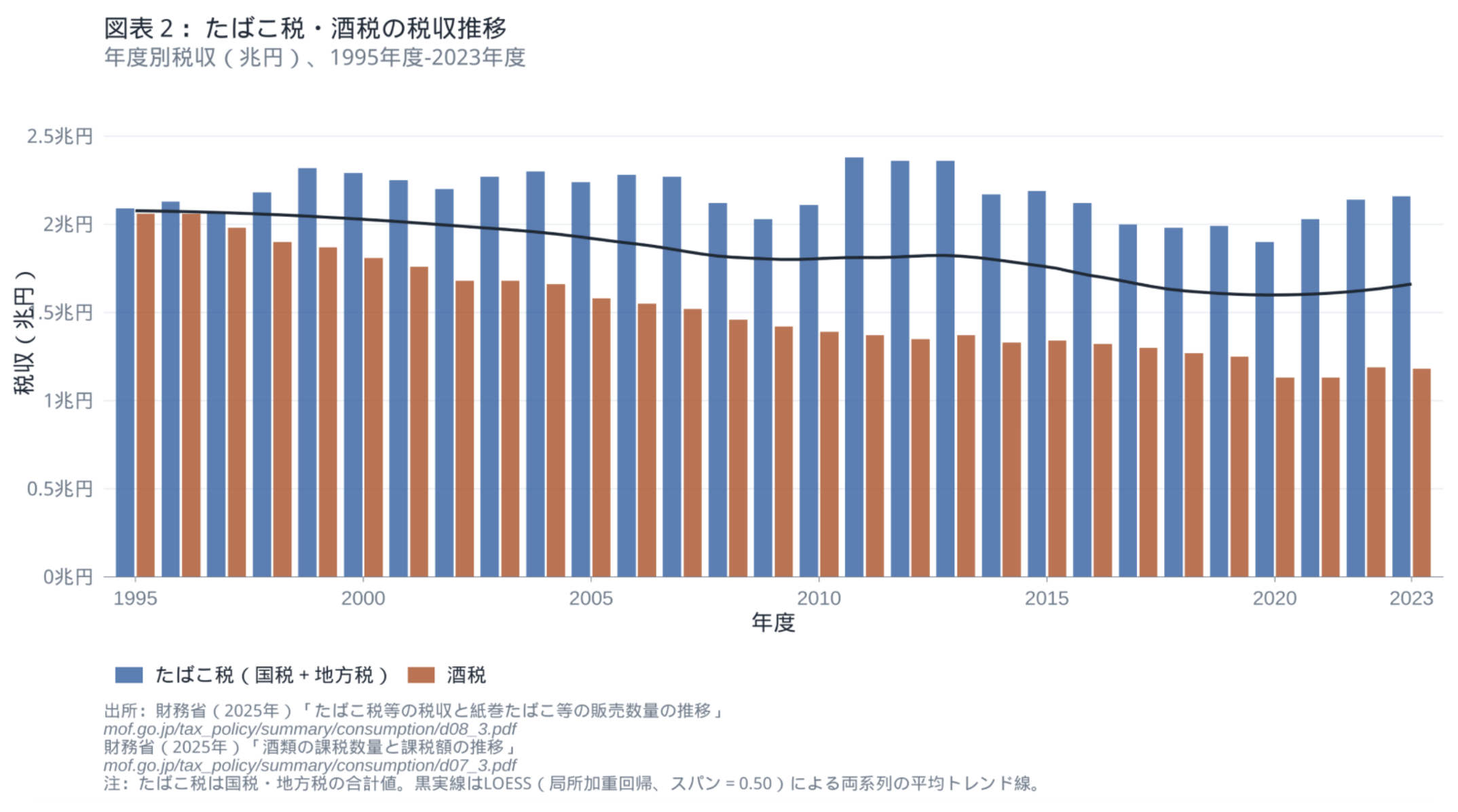 このような税収の下限水準があるにもかかわらず、長期的な構造的軌道は減少傾向にある。日本の成人の喫煙率は、1980年代後半の35%超から2020年代初頭には18%未満にまで低下しており、年間の紙巻たばこ販売本数は1996年の3480億本から2020年には1000億本を下回る水準にまで急減している。¹⁴したがって、医療に特化した税は、課税ベースが浸食されるにつれて収穫逓減に直面することになる。また、「悪行税(シンタックス)」モデルには内在的な矛盾も存在する。つまり、高い税率は消費の抑制と税収の増加という双方を目的として設計されているという点である。