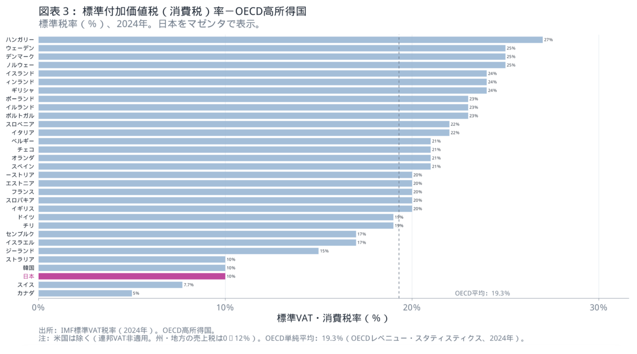 日本の消費税率は、比較可能な他の先進諸国よりも大幅に低い水準にとどまっている。2024年度のOECD諸国における付加価値税の標準税率の平均は19%を超えており、日本の10%という税率はそのほぼ半分にすぎない。²⁵ 国際通貨基金(IMF)の分析によれば、消費税を現在の10%から15%に引き上げることで、日本の財政を中期的に持続可能な軌道に乗せるために必要な財政調整の大部分を賄うことができると指摘されている。²⁶