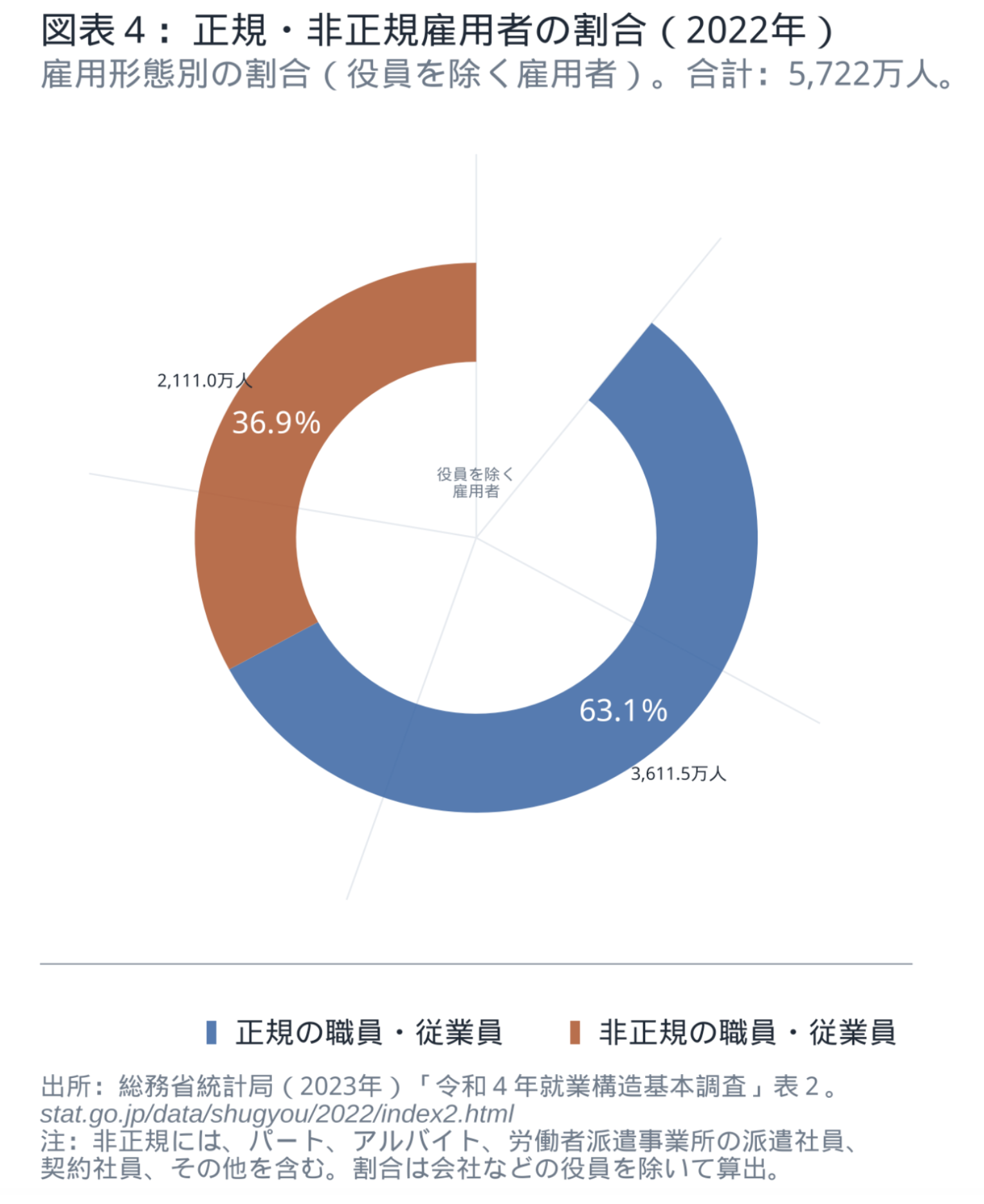 第二の制度である国民健康保険(国保)は、被用者保険の対象とならない人々、すなわち自営業者、農業従事者、75歳未満の退職者、そしてとりわけ重要なこととして、そして社会保険の適用除外となっている一部の非正規労働者を受け入れる残余的な制度として機能している。現在、非正規労働者は日本の全就業者の約37%を占めており、1990年代初頭⁴¹から大幅に増加している。2023年度現在、約42万人が国保に加入している。国保には事業主負担の仕組みがないため、加入者は保険料の全額を自己負担することになる。⁴²