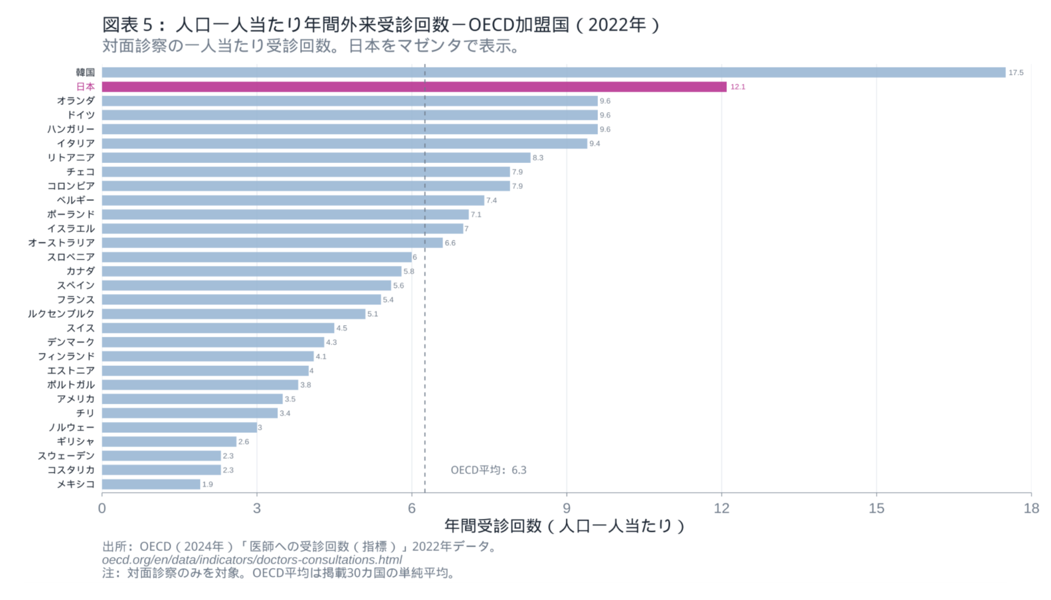 日本における1人当たりの年間平均外来受診回数は約12~13回と推計されており、OECD平均の約6~7回と比較して2番目に高い水準にある。⁴⁸ この受診傾向は、単にモラルハザードのみに起因するわけではない。日本の高齢化社会には正当な医療ニーズが存在する。しかし、日本特有のモラルハザードに関する先行研究は、窓口負担の撤廃または軽減が、純粋な健康上の必要性から予測される水準を超えて受診回数を増加させることを一貫して示している。⁴⁹