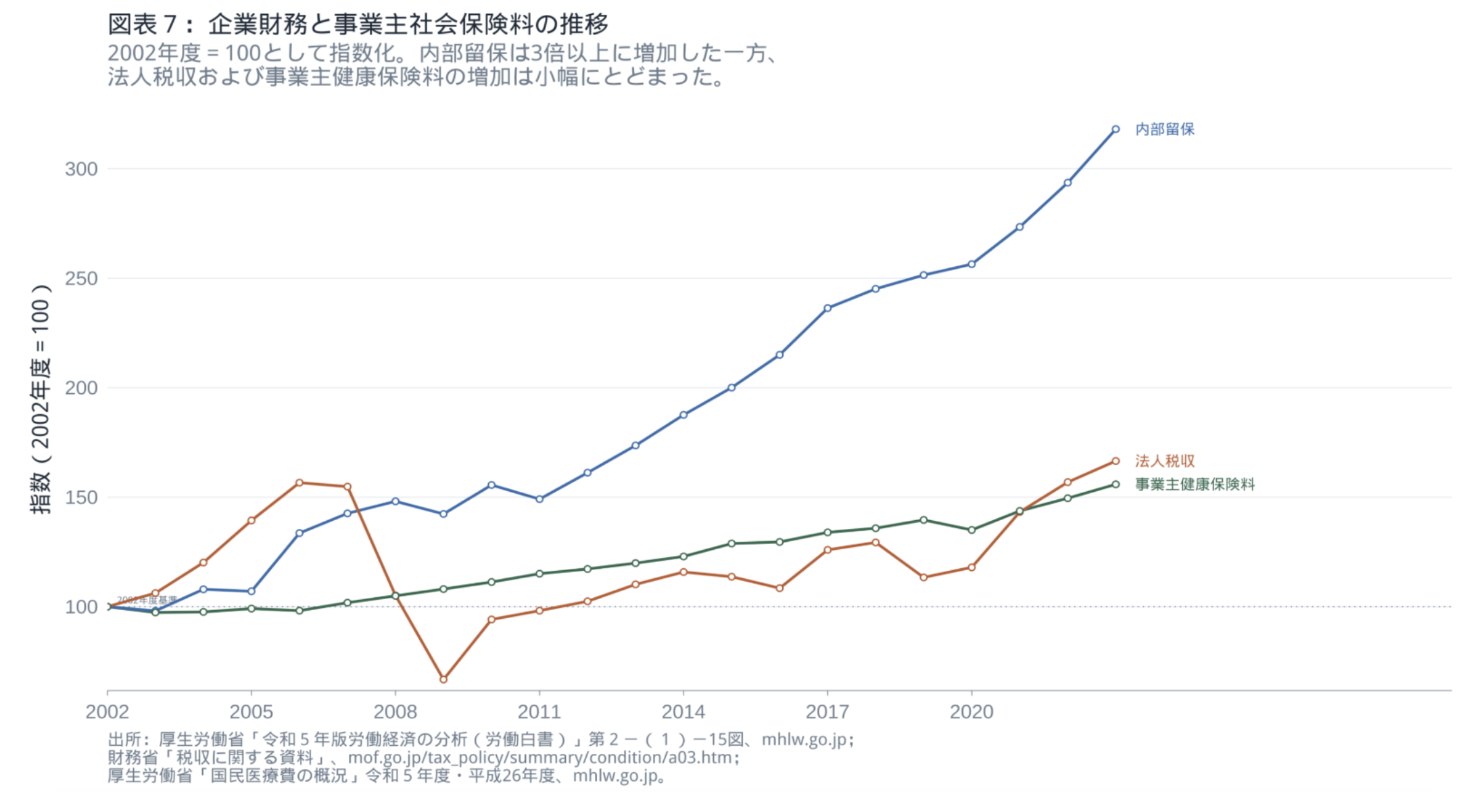 また非金融法人企業が保有する金融資産の総額は2025年12月時点で1,673兆円に達しており、過去20年間で2倍以上に増加し、同期間における社会保険料の事業主負担の伸びを上回っている。⁵⁷ 一方、法人税収は景気循環に伴って激しく変動し、2008年から2009年の金融危機時には3分の1近く落ち込んだ後、回復に向かい、2023年末時点では約15兆9,000億円(2002年比で名目66%増)となった。
